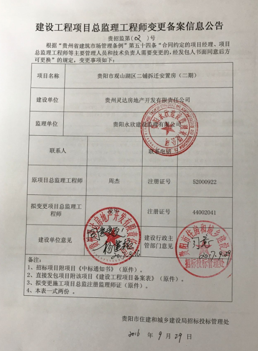 2017贵招监第(2)号贵阳市观山湖区二铺拆迁安置房(二期)总监理工程师变更公告