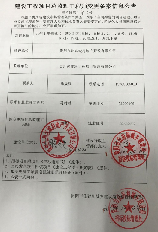 2017贵招监第(3)九州十里锦城(一期)项目总监理工程师变更公告