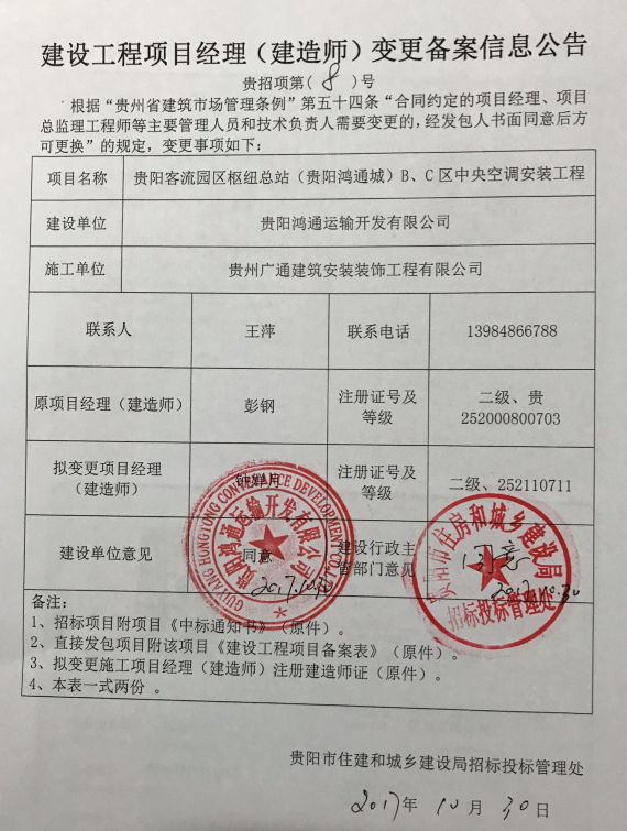2017贵招项第(11)号贵阳客流园区枢纽总站C区屋顶加建工程项目经理变更公告