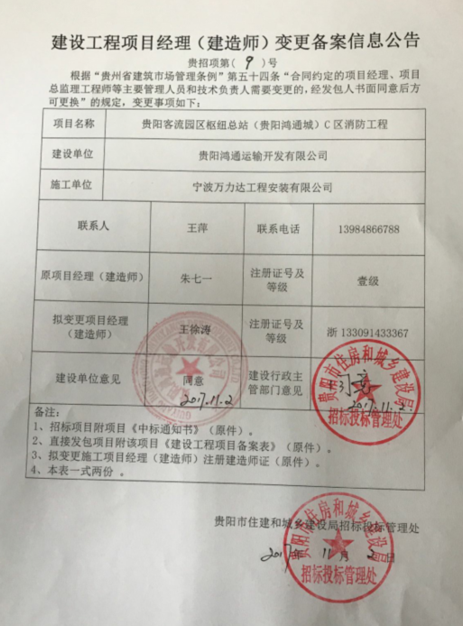 2017贵招项第(9)号贵阳客流园区枢纽总站C区消防工程项目经理变更公告