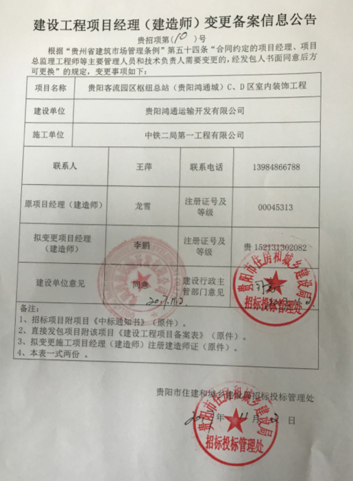 2017贵招项第(10)号贵阳客流园区枢纽总站C、D区室内装饰工程项目经理变更公告