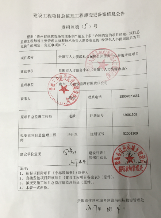 2017贵招监第(5)贵阳市人力资源社会保障公共服务中心异地迁建项目总监理工程师变更公告