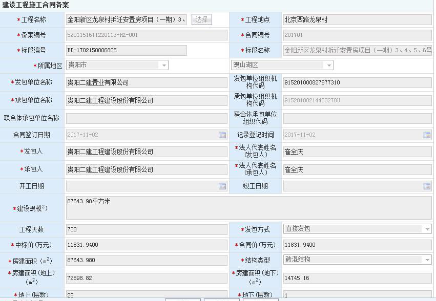 金阳新区龙泉村拆迁安置房项目(一期)工程施工合同备案信息