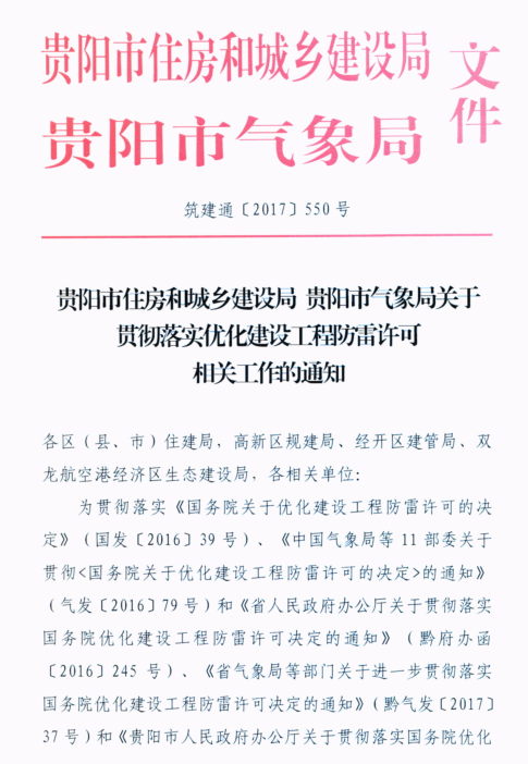 筑建通[2017]550号关于贯彻落实优化建设工程防雷许可相关工作的通知