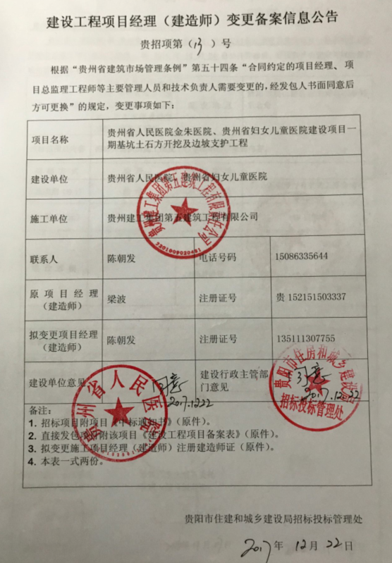 2017贵招项第(13)号贵州省人民医院金朱医院...边坡支护工程项目经理变更公告