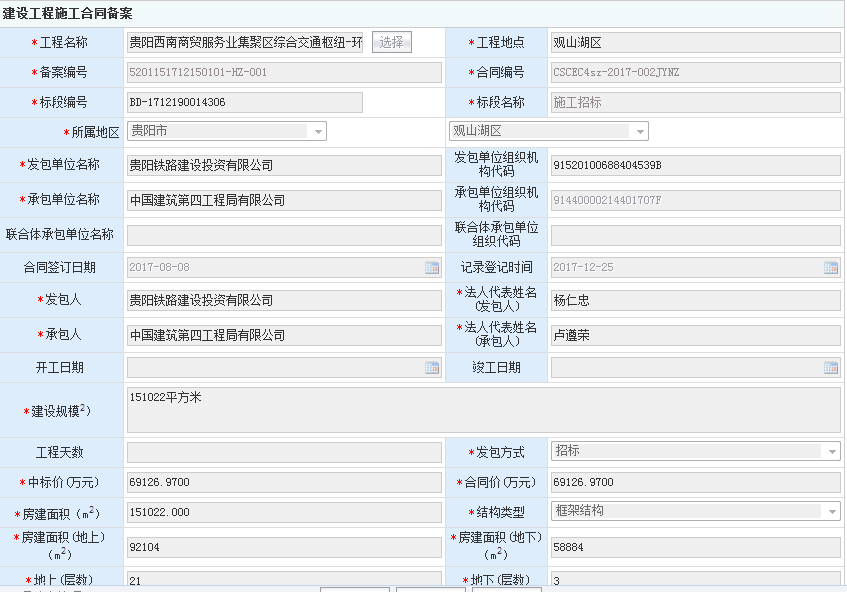 贵阳市轨道交通1号线金阳车辆段与综合基地施工合同备案信息