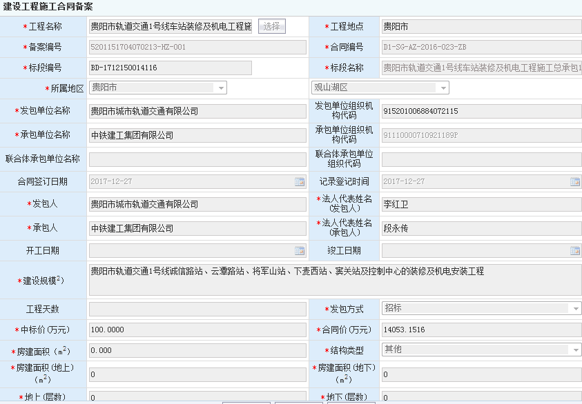贵阳市轨道交通1号线车站装修及机电工程施工合同备案信息
