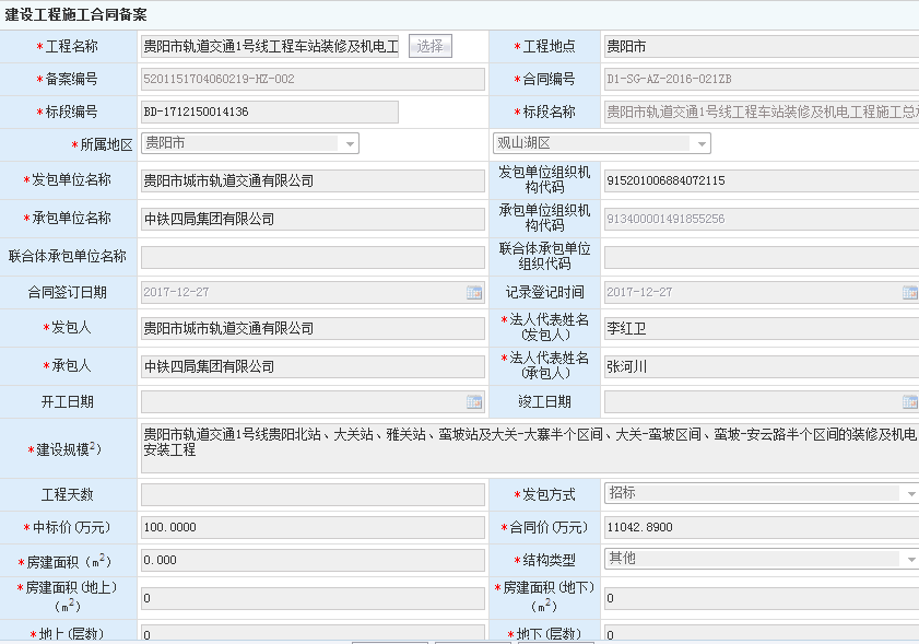 贵阳市轨道交通1号线车站装修及机电工程施工合同备案信息