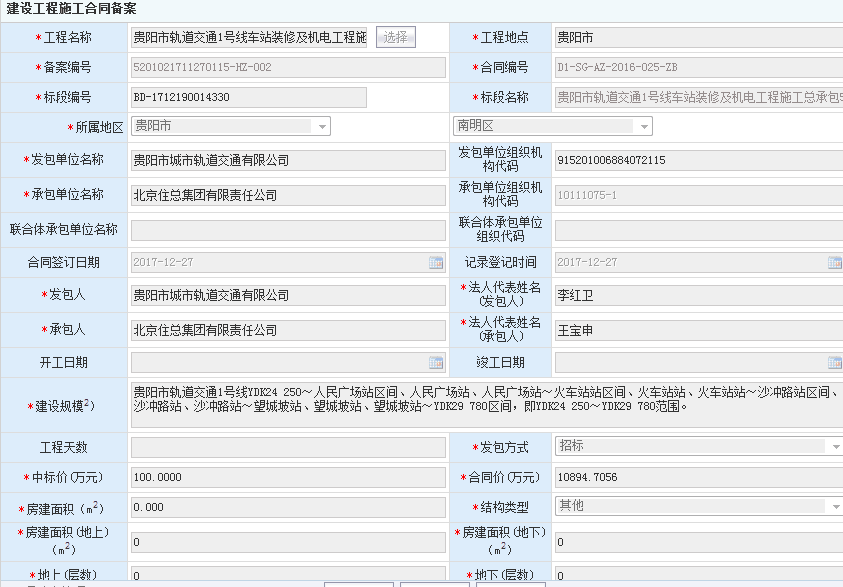 贵阳市轨道交通1号线车站装修及机电工程施工合同备案信息