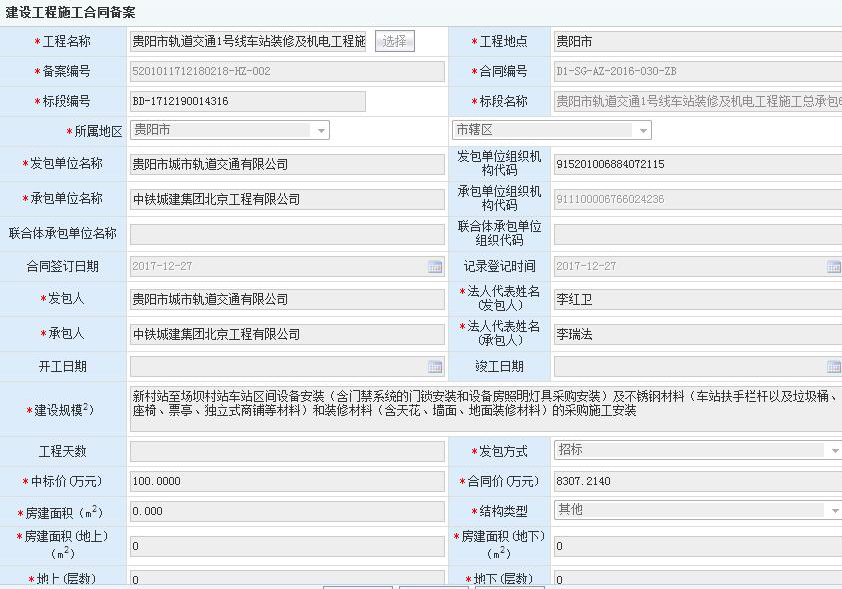 贵阳市轨道交通1号线车站装修及机电工程施工合同备案信息