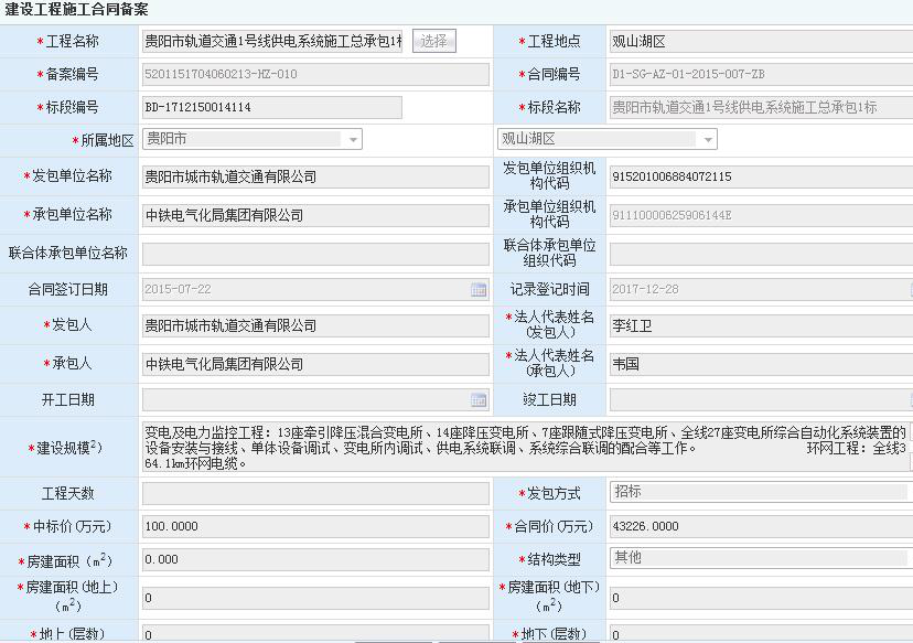 贵阳市轨道交通1号线供电系统施工总承包施工合同备案信息