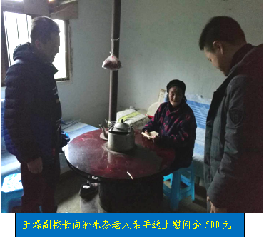 最后,王磊副校长和田辉同志一行人来到困难户贾应凯家中,详细询问他们的生产、生活情况,帮扶措施及物资落实情况以及当前困难和需求等情况。了解到,贾应凯家有两口人,父亲83岁,常年有病;贾应凯本人脚有残疾,至今未婚,会木工技术,靠务农和政府救济维持生计;大儿子多年前成家,户口已经分离;小儿子在浙江打工,多年未归家。在结对帮扶中,市住建局出资1万元帮扶其硬化院坝(100平米),购买母牛一头。目前,生活条件已有明显改善。临走之时,王副校长亲手向他们送上慰问金500元,腿脚有残疾的老人坚持要站起送行,让人十分感动。