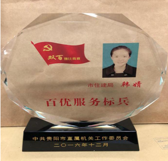 2016年,按照《市直机关工委关于推荐评选市直机关第六批“百佳效能处室、服务窗口”和“百优服务标兵”的通知》文件精神,市住建局推荐置业担保公司资金监管窗口员工韩婧同志参评,该同志获得“百优服务标兵”称号。