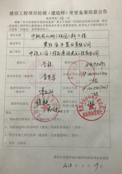 2018贵招项第(14)号中铁阅山湖C组团二期工程项目经理变更公告